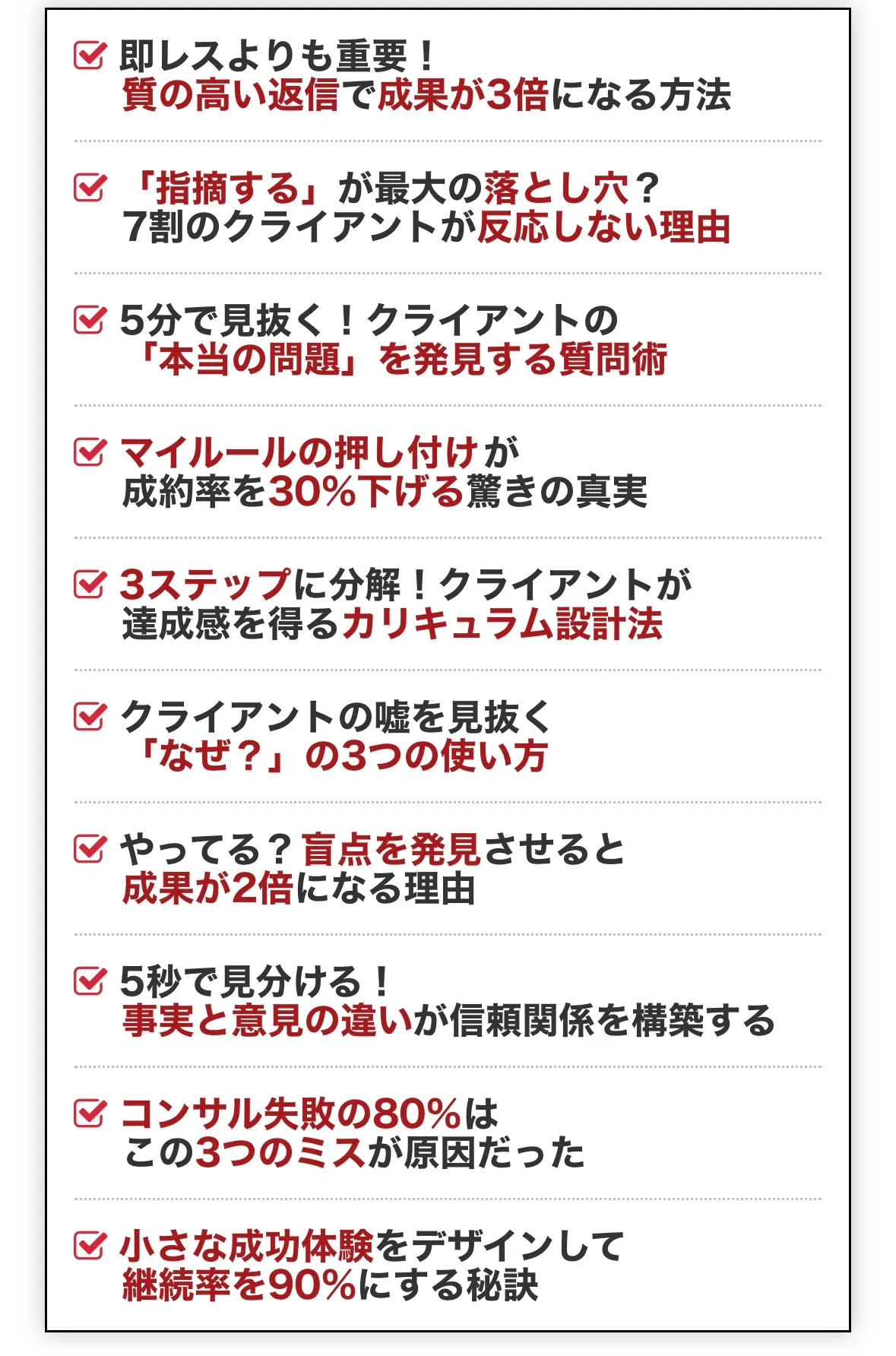 | あなたが得られるモノ | ◎あなたの発信ジャンル決め (3つの選択基準でズバリ決定) ◎あなた専用の3種類のリサーチ方法 (競合・顧客・市場) ◎あなただけの刺さるコンセプトの作り方 (7つの質問で明確化) ◎あなたが作るべきコンテンツの具体的内容 (テーマから構成まで) ◎あなたの商品を売るための販売導線・仕組みの構築方法 (ステップバイステップ) 【豪華3大参加特典】 ・オリジナルロードマップ画像 ・コンセプト設計シート ・リサーチテンプレートシート ✅ あなただけのオリジナルロードマップが手に入る ✅ 迷いなく次に何をすべきかが明確になる ✅ コンテンツビジネスの全体像が理解できる ✅ 自分のジャンルに特化した戦略が分かる ✅ 実際にやるべき行動が具体的に見える ✅ つまずきやすいポイントとその対策がわかる ✅ 7年間の実践で培った「生きたノウハウ」が手に入る ✅ 月200〜300万円を売り上げるまでの超具体的なステップが明確になる |